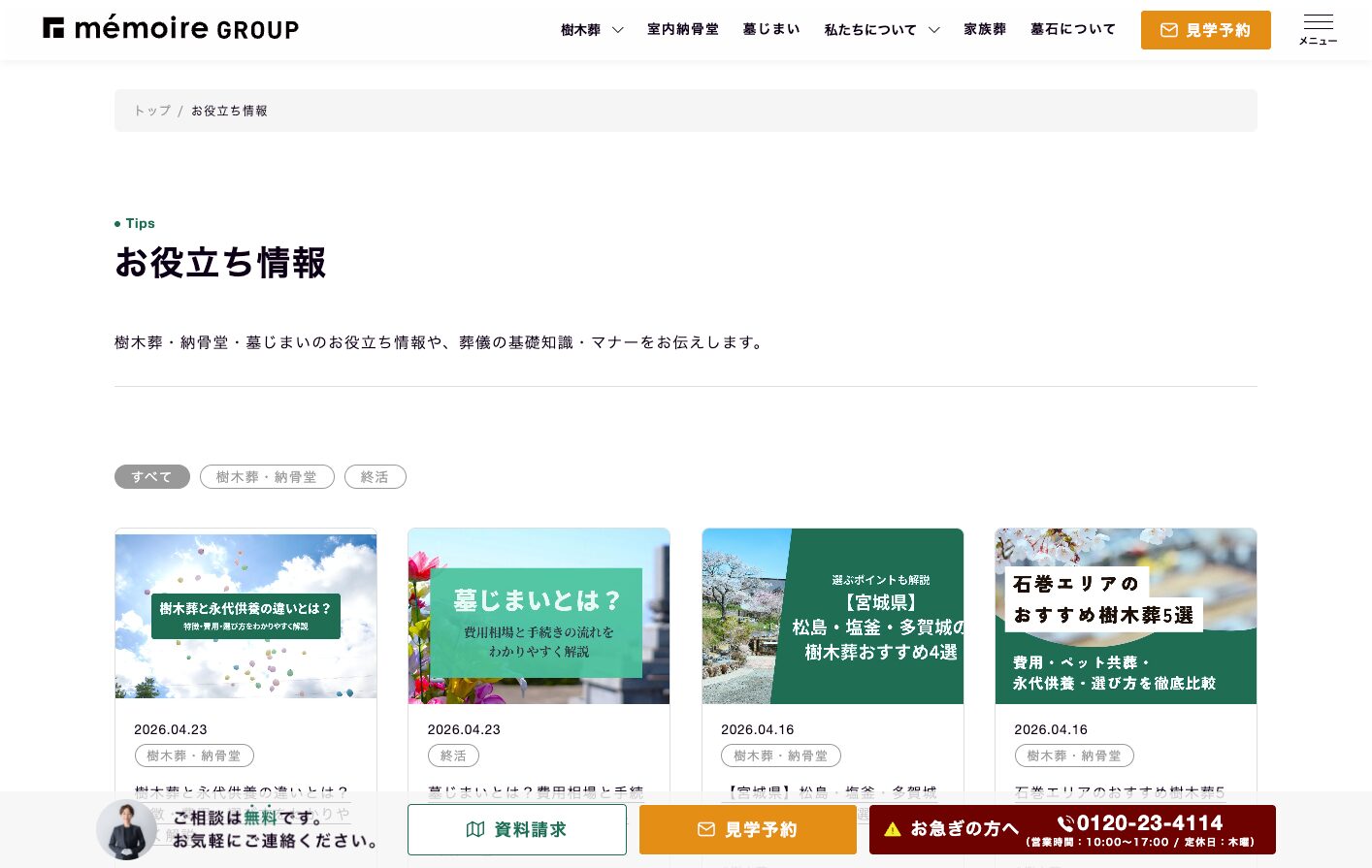 本サイトは、終活を考える皆様が気になる情報や、主要サービスである「樹木葬」「室内納骨堂」など、各種サービスについて詳細に掲載されています。